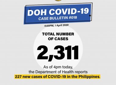 (Eagle News) – Total confirmed coronavirus cases in the country again rose dramatically, climbing to 2,311 after the addition of 227 new cases, the Department of Health said. The DOH also reported eight additional COVID-19 related deaths on Wednesday, April 1, bringing the total fatalities to 96. One patient, a 59-year old Filipino male from Taguig City, also recovered. Patient no. 179 had no travel history. He was discharged after two negative test results […]