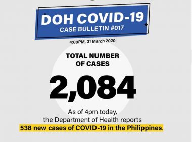 Biggest single-day jump for COVID-19 cases in PHL so far (Eagle News) – Coronavirus cases continued to rise in the country with the expanded COVID-19 testing as total cases reached 2,084, with the addition of 538 new cases – the biggest single-day jump in cases so far, the Department of Health said. The latest data as of 4 p.m. Tuesday, March 31, also included seven new recoveries in the country. This brings to 49 […]