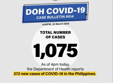 (Eagle News) — The Department of Health announced 272 new confirmed COVID-19 cases, bringing national total to 1075. “This is the highest single day increase since the start of the outbreak,” the DOH statement said. The department also confirmed that 14 COVID-19 patients have died, bringing the total number of coronavirus deaths to 68. The DOH earlier warned that the confirmed cases are expected to rise significantly in the coming days because of the […]