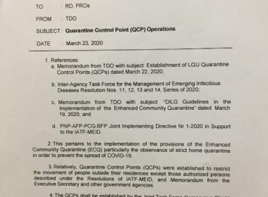 DOJ: No PNP, no barangay checkpoint (Eagle News)–All barangay checkpoints must now be under the supervision of the Philippine National Police. According to Justice spokesperson Markk Perete, “no PNP, no barangay check points.” In a memorandum from the PNP headquarters signed by Police Major General Emmanuel Luis Licup, all quarantine control points at the barangay level shall be specifically supervised by the unit commander or the chiefs of police. “In this regard, all unit commanders, […]