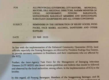 (Eagle News)–The Department of the Interior and Local Government has reminded local government units that the gatepasses issued to each household so they could buy their basic needs are free of charge. Interior Secretary Eduardo Año issued the reminder amid reports some barangays were charging their constituents for the same. In an advisory, Año also reminded LGUs that frontliners, upon presentation of their identification card that shows their places of residence, shall not be required […]