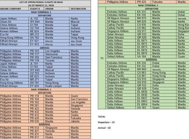 (Eagle News)–The Manila International Airport Authority released on Sunday, March 22, a list of operational flights amid the enhanced community quarantine. According to the list, there are 65 operational flights–35 departures and 32 arrivals. Below is the list: The Philippine government has imposed travel restrictions on select travelers from specific countries in a bid to contain the spread of the coronavirus disease 2019. The country has so far recorded 380 COVID-19 cases, with 25 deaths.