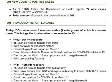 (Eagle News) – The country’s total confirmed coronavirus cases had risen to 307, with the addition of 77 new cases, the Department of Health (DOH) announced on Saturday, March 21. The new cases were only identified as patients number 231 to 307 or PH231 to PH307. This is the highest single-day jump for COVID-19 cases in the country. -Five more patients recover from COVID-19, bringing total to 13- The DOH also announced five new […]
