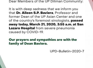 (Eagle News)–A former dean of the University of the Philippines’ Asian Center has passed away due to severe pneumonia caused by the coronavirus disease 2019. In an advisory, UP Diliman said Dr. Aileen S.P. Baviera, one of the country’s foremost sinologists, died in the San Lazaro hospital at 3:55 a.m. today. No other details were available. The Philippines has recorded over 200 COVID-19 cases.