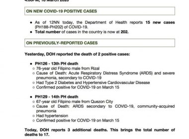 (Eagle News) – The Department of Health announced 15 new cases of the coronavirus disease in the Philippines, bringing the total number of confirmed COVID-in infections to 202. The DOH also reported three additional deaths due to the virus on Wednesday, March 18, raising the number of COVID-19 fatalities to 17. The additional 15 cases were reported only as of 12 noon today, Wednesday, March 18, amid the enhanced community quarantine in the whole […]