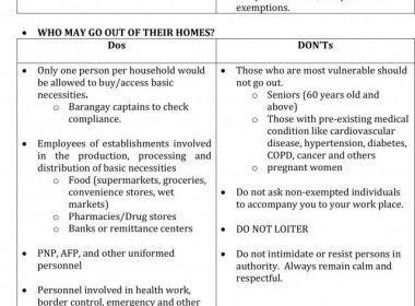 (Eagle News) — The Palace on Wednesday, March 18, released the do’s and dont’s during the enhanced community quarantine on Luzon. The Luzon-wide quarantine started on March 17 and is expected to end on April 13, or earlier or later, depending on the situation. Below are the do’s and dont’s: The Philippines has so far recorded 193 COVID-19 cases, with 14 deaths. Seven have recovered.