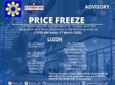 (Eagle News) – The Department of Energy announced the imposition of a 15-day price freeze on household LPG and kerosene in several areas where a state of calamity was declared due to the 2019 coronavirus disease. In an advisory, the DOE said that within the 15-day period, a roll back of prices will be implemented, while price increases are strictly prohibited. The price freeze covers the following areas: LUZON March 13-27 Quezon City March 14-28 […]