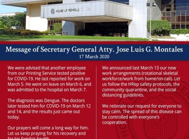 (Eagle News)- Another employee of the House of Representatives’ Printing Service has tested positive for the coronavirus disease (COVID-19). In a statement issued on Tuesday, March 17, House Secretary General Atty. Luis Montales said that the employee last reported for work on March 5, went on leave on March 6, and was admitted to the hospital on March 7 where he was initially diagnosed with dengue. “The doctors later tested him for COVID-19 on […]