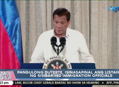https://www.youtube.com/watch?v=qjPs8gyAWAQ (Eagle News) – Isinasapinal na umano ni Pangulong Rodrigo Duterte ang listahan ng mga opisyal ng Bureau of Immigration (BI) na kanyang sisibakin sa pwesto dahil sa umano’y pagkakasangkot sa pastillas scheme sa Ninoy Aquino International Airport (NAIA) Sinabi ito ng Pangulo sa kaniyang talumpati sa panunumpa ng mga bagong talagang opisyal ng gobyerno sa Malacanang Palace. Nagpahayag din ng pagkadismaya ang Pangulo dahil ilan aniya sa mga opisyal na nasa kaniyang listahan […]