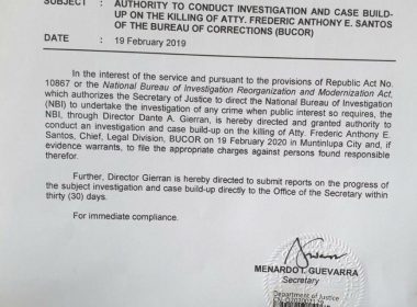 (Eagle News) – The Department of Justice has asked the National Bureau of Investigation (NBI) to investigate the killing of the Bureau of Corrections former legal chief who was gunned down on Wednesday afternoon, Feb. 19, in Muntinlupa City as he was about to fetch his young daughter at school. In Department Order No. 82 dated Feb. 19, Justice Secretary Menardo Guevarra directed the NBI to “conduct an investigation and case build-up on the […]