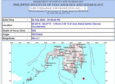(Eagle News) – A magnitude 6.1 quake struck off the coast of Davao Occidental, with the epicenter located 118 kilometers southeast of Jose Abad Santos town, according to the Philippine Institute of Volcanology and Seismology (PHIVOLCS) The quake of tectonic origin was 20 kilometers deep. It occurred at 9:40 p.m. on Thursday, Feb. 6. Reported intensities are as follows: Intensity IV – Glan, Sarangani Intensity III – Alabel, Sarangani; General Santos City; Davao City Intensity […]