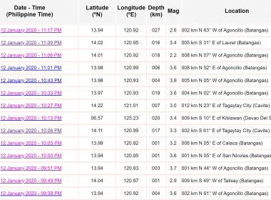 (Eagle News)-A 4.1-magnitude quake hit Batangas on Sunday, Jan. 12. The Philippine Institute of Volcanology and Seismology said the quake, which struck at 11:56 p.m., had its epicenter 7 kilometers northeast of Agoncillo. Depth of focus was 8 kilometers. The following intensity and instrumental intensities were recorded: Intensity: Intensity V – Tagaytay City Instrumental Intensity: Intensity IV -Tagaytay City No damage to property nor aftershocks were recorded.