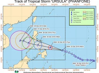 (Eagle News)-Tropical Storm “Phanfone,” now named “‘Ursula,” has entered the Philippine Area of Responsibility. The Philippine Atmospheric Geophysical and Astronomical Services Administration said the weather disturbance entered PAR at 5 a.m. Tropical Cyclone Wind Signal No. 1 has been hoisted over Eastern Samar, Dinagat Islands, and the insular municipalities of Surigao del Norte such as Burgos, Sta. Monica, San Isidro, San Benito, Del Carmen, Pilar, Dapa, Gen. Luna, Socorro, as the center of “Ursula” was […]