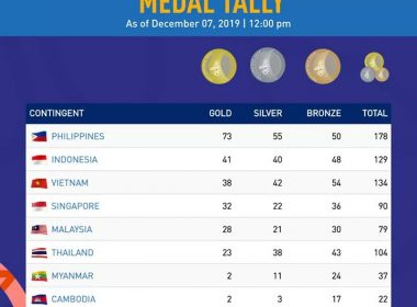 (Eagle News)–This table provided by South East Asian Games 2019 organizers shows the medal tally of participating countries in the biennial sports event. The tally, which is as of noon, December 7, shows the Philippines pulling away with 73 golds, 55 silvers and 50 bronzes, for a total of 178 medals. Vietnam holds second place with 38 golds, 42 silvers and 54 bronzes, or 134 medals. Indonesia is in third place, with 41 golds, 40 […]