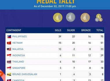 (Eagle News)–This table provided by Southeast Asian Games 2019 organizers shows the medal tally of participating countries in the sporting event. The Philippines continues to lead the pack, with 39 golds, 22 silvers and 14 bronzes, for a total of 75 medals.