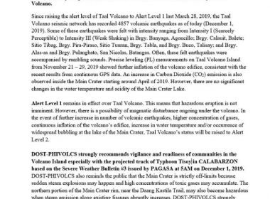 (Eagle News)–The Philippine Institute of Volcanology and Seismology has issued a Taal volcano advisory, with “Tisoy’s” track expected to include Calabarzon. In the advisory, PHIVOLCS reiterated that the entire volcano island was strictly a Permanent Danger Zone and is not recommended for permanent settlement at all times. The main crater, it said, was strictly off-limits because “sudden steam explosions may happen and high concentrations of toxic gases may accumulate,” PHIVOLCS said. “The northern portion of […]