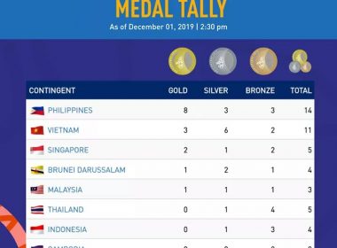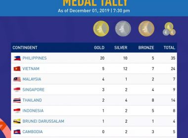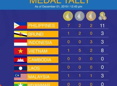 (Eagle News) — The Philippines leads the medal tally for the 30th Southeast Asian Games (SEA Games) on Sunday, Dec. 1, with 21 golds, 11 silvers and seven bronze medals, for a total of 39 medals, as of 10 p.m. The host country won gold medals in the following sports (renew for updates): 1. men’s triathlon event, John Chicano; 2. women’s wushu, Agatha Wong; 3. women’s triathlon, Kim Mangrobang; 4. dancesport – single dance waltz, […]