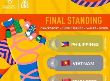 (Eagle News)–The Philippines added golds to its medal tally on Sunday, Dec. 1, with wins in different categories in the dancesport event. Mark Jayson Gayon and partner May Joy Renigen took home the gold in the Standard Waltz and Slow Foxtrot categories. Sean Mischa Aranar and Ana Leonila Nualla, on the other hand, dominated the Viennese Waltz and Tango events. With their wins, the Philippines’ gold medal tally rises to seven.
