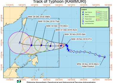 (Eagle News) — Typhoon “Kammuri” has remained almost stationary in the last six hours but is still forecast to enter the Philippine Area of Responsibility over the weekend. The Philippine Atmospheric Geophysical and Astronomical Services Administration said as of 3 p.m., “Kammuri” was located 1455 kilometers east of Southern Luzon, packing maximum sustained winds of 140 kilometers per hour and gustiness of up to 170 kph. PAGASA said “Kammuri” is forecast to enter PAR between […]