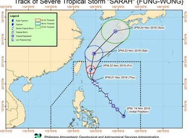 (Eagle News)–Signal No. 1 remains hoisted over Batanes as Severe Tropical Storm “Sarah” further intensified. The Philippine Atmospheric Geophysical and Astronomical Services Administration said as of 4 p.m., “Sarah” was situated 255 kilometers east of Basco, packing maximum sustained winds of 110 kph near the center and gustiness of up to 135 kph. “Sarah” is moving northwest at 10 kph. The remnant Low Pressure Area of Tropical Depression “Ramon,” on the other hand, was estimated […]
