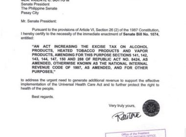 (Eagle News) — President Rodrigo Duterte has certified as urgent a bill increasing the excise tax on alcohol, heated tobacco products and vapor products. In a Nov. 12 letter to Senate President Tito Sotto, Duterte said he was certifying Senate Bill No. 1074 as urgent to “address the urgent need to generate additional revenue to support the effective implementation of the Universal Health Care Act..” He said this was also to “further protect the right […]