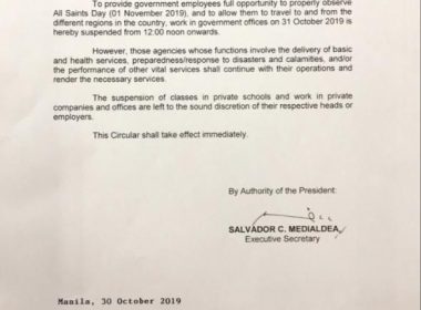 (Eagle News)–Work in government offices on Thursday, Oct. 31, is suspended by noon. Memorandum circular number 69 signed by Executive Secretary Salvador Medialdea said the suspension was to allow government employees to travel to and from the different regions in the country for the holidays. “However, those agencies whose functions involve the delivery of basic and health services, preparedness/response to disasters and calamities, and/or the performance of other vital services shall continue with their operations […]