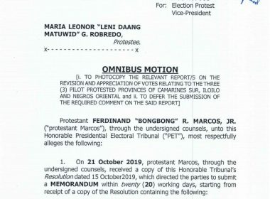 Wants “voluminous” report photocopied first (Eagle News)–The camp of former Senator Bongbong Marcos has asked the Presidential Electoral Tribunal he be allowed to defer the submission of his comments on the report on the revision and appreciation of votes in Negros Oriental and two other areas. In a five-page motion, Marcos requested for the deferment until his camp gets copies of the “voluminous” documents. For this, Marcos requested the PET for specific 15 individuals to […]
