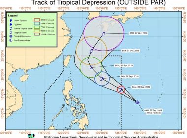 TD “Onyok” to enter PAR within 24 to 36 hours (Eagle News)–The low pressure area monitored outside the Philippine Area of Responsibility has developed into a tropical depression and is expected to enter PAR within 24 to 36 hours. The Philippine Atmospheric Geophysical and Astronomical Services Administration said once inside PAR, the tropical depression will be named “Onyok.” It may also intensify into a tropical storm within 24 hours even if it is less likely […]