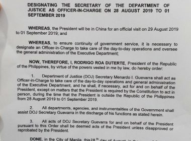(Eagle News)–Justice Secretary Menardo Guevarra has been designated the caretaker of the government while President Rodrigo Duterte is on official visit to China. Special Order No. 916 signed by Executive Secretary Salvador Medialdea and by Duterte said Guevarra shall be officer-in-charge from Aug. 28 to Sept. 1. The order said Guevarra shall therefore take care of the “day-to-day operations and general administration of the executive department” and shall “if necessary, act for and on behalf […]