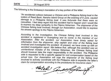 (Eagle News)–Foreign Affairs Secretary Teddy Locsin said he “merely noted” the apology issued by the owner of a Chinese vessel that rammed a Filipino fishing vessel in Recto Bank and abandoned the Filipino crew at sea. Locsin made the comment in a Tweet on Wednesday night, after the Palace said it “accept(s) the recent apology extended by the owner of the Chinese vessel to our fishermen affected by the incident.” The apology was contained in […]