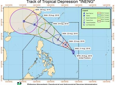 (Eagle News)–Tropical Depression “Ineng” has maintained its strength as it moved in a northwest direction on Wednesday, Aug. 21. The Philippine Atmospheric Geophysical and Astronomical Services Administration said as of 10 a.m., the center of the tropical depression was located 1,155 kilometers east of Infanta, Quezon. It is packing maximum sustained winds of up to 55 kilometers per hour near the center and gustiness of up to 70 kilometers per hour, and is moving slowly. […]