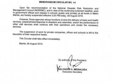 (Eagle News)–Work in government offices in Metro Manila has been suspended effective 3 p.m. Also suspended effective that time, based on a memorandum issued by Malacañang and signed by Executive Secretary Salvador Medialdea, are classes at all levels in both public and private schools in the National Capital Region. The Palace said the suspension was upon recommendation by the National Disaster Risk Reduction and Management Council and “in view of the continuing inclement weather.” “However, […]