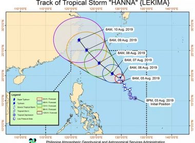 Is seen to become severe tropical storm in 24 hours (Eagle News)–Tropical Storm “Hanna” slightly intensified on Monday, Aug. 5, as it moved in a north northwestward direction. In its 11 a.m. advisory, the Philippine Atmospheric Geophysical and Astronomical Services Administration said as of 10 a.m., the center of the tropical storm was 875 kilometers east of Tuguegarao City, Cagayan. “Hanna” is packing maximum sustained winds of up to 85 kilometers per hour near the […]