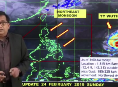 (Eagle News)—“Wutip” may enter the Philippine Area of Responsibility next week, the Philippine Atmospheric Geophysical and Astronomical Services Administration said. According to Aldczar Aurelio, Pagasa weather specialist, the typhoon may enter PAR on Wednesday, Feb. 27, or Thursday, Feb. 28. Once it enters PAR, it will be named “Betty,” he said. So far, the typhoon was located 1815 kilometers east of Visayas, outside PAR, packing maximum sustained winds of 185 kilometers per hour near, and […]