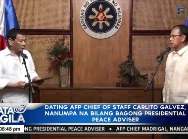 (Eagle News) — Opisyal nang bahagi ng gabinete ni Pangulong Rodrigo Duterte si retired Armed Forces Chief General Carlito Galvez Jr. Nitong Lunes, Enero 7 ay nanumpa na ito kay Pangulong Duterte bilang Presidential Adviser on the Peace Process. Kasama ni Galvez ang kanyang asawa, mga anak at si Defense Secretary Delfin Lorenzana. Kagabi ay dumalo na rin ito sa 33rd monthly cabinet meeting na isinagawa sa presidential palace. Pinalitan ni Galvez si Jesus Dureza […]