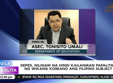 (Eagle News) — Nilinaw ng Department of Education (DepEd) na wala namang sinasabi ang Korte Suprema na alisin na ang Filipino subject sa mga asignatura sa kolehiyo. Ayon kay Education Undersecretary Tonisito Umali, ang sinasabi lamang aniya ng kataas-taasang hukuman ay wala namang malalabag na batas sakaling ipatupad ito. Pero sa panig ng DepEd, nilinaw ni Umali na hindi nila pinapalitan ng Korean language ang Filipino subject dahil mas palalawigin at mas lalaliman pa aniya […]