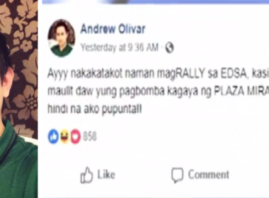 Ni Moira Encina Eagle News Service (Eagle News) — Hindi tinanggap ng Department of Justice (DOJ) ang reklamong kriminal na ihahain sana ng NCRPO laban sa blogger na si Andrew Olivar kaugnay sa bomb scare post nito sa Facebook. Pasado alas tres ng hapon (3:00 PM) nang dumating sa DOJ ang ilang tauhan ng NCRPO Regional Investigation and Detective Management Division para kasuhan sana si Olivar. Pero ayon kay NCRPO-PIO Senior Inspector Myrna Diploma, tinanggihan […]