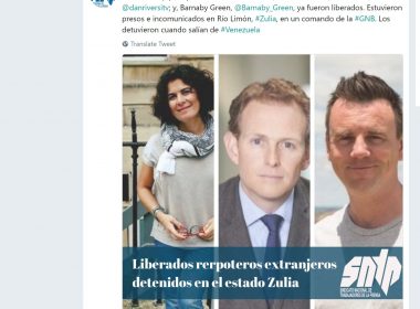 CARACAS, Venezuela (AFP) —Two British journalists and an Argentine were freed on Friday eight hours after being detained by the Venezuelan military, the national press union (SNTP) said. Argentine Laura Saravia along with British nationals Barney Green and Dan Rivers were released after being held incommunicado, the SNTP said on Twitter. They were detained “as they left the country” after having been in “Venezuela for three days reporting on tourism,” the union said earlier. Three people […]