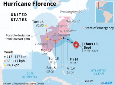 by Sébastien DUVAL / with Leila Macor in Columbia, South Carolina Agence France-Presse WILMINGTON, United States (AFP) — Dangerous Hurricane Florence edged closer Thursday to delivering a powerful blow to the east coast of the United States, with forecasters warning of life-threatening rainfall and flooding even as it weakened to a Category 2 storm. As day broke for millions of jittery Americans in the monster storm’s path, rain from the Florence’s outer bands approached the […]