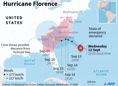 by Sébastien DUVAL / with Leila Macor in Columbia, South Carolina Agence France Presse Hurricane Florence veered slightly to the southwest and weakened a bit on Wednesday but remained a powerful storm on course to deliver a potentially devastating blow to the Carolina coast. Georgia joined four other East Coast states issuing an emergency declaration as the latest forecasts showed Florence dumping torrential rain on the southern state. As Florence churned across the […]