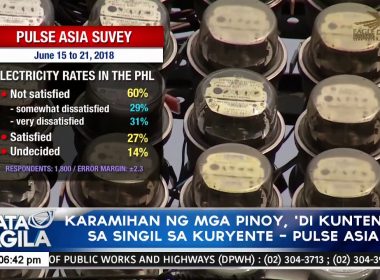 (Eagle News) — Karamihan sa mga Pilipino ang hindi kontento sa pagbaba ng presyo ng kuryente sa bansa.. Batay sa resulta ng isinagawang survey ng Pulse Asia, 60 percent ng karamihan sa mga Pinoy ang hindi nasasapatan sa singil sa kanilang kuryente. Sa resulta ng ulat ng Bayan Survey, 60 percent ang nagsabing ‘di sila nasasapatan, 29 percent ang nagsabing medyo ‘di sila nasasapatan, habang 31 percent ang talagang ‘di nasasapatan. Ang nasabing survey ay […]