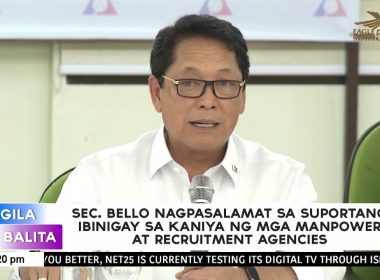 (Eagle News) — Nagpasalamat si Labor Secretary Silvestre Bello III sa suportang ipinagkaloob sa kaniya ng samahan ng mga lisensyadong recruitment at manpower agencies sa bansa. Kahapon, binasa ng mga Pangulo ng halos isandaan limampung (150) land-based recruitment agencies ang kanilang manifest of support kay Bello. Nanawagan din ang mga ito kay Pangulong Rodrigo Duterte na panatilihin si Bello sa labor department. Ayon kay Bello, malaking bagay sa kaniya ang nasabing suporta dahil ilang araw […]