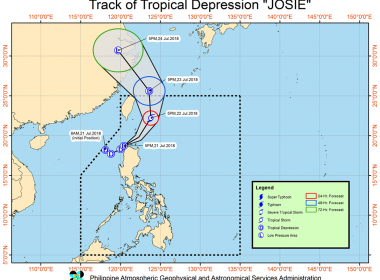 (Eagle News)–Rains are expected in several parts of Luzon as Tropical Depression “Josie” approaches Ilocos Norte, the Philippine Atmospheric, Geophysical and Astronomical Services Administration said on Saturday, July 21. In its 5 p.m. bulletin, PAGASA said as of 4 p.m., the center of “Josie” was 55 kilometers northwest of Laoag City, and is closing in on the Burgos-Pagudpud area. “Josie” is packing maximum sustained winds of up to 55 kilometers per hour near the center, […]
