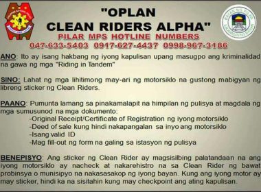 (Eagle News)– Hinikayat ng Philippine National Police (PNP) ang lahat ng mga motorcycle riders sa bansa na lahukan ang bagong kampanya ng mga kapulisan na “Oplan Clean Riders Alpha.” Ang nasabing kilusan ay isang hakbang upang masugpo ang kriminalidad na gawa ng mga riding in tandem, mga krimen na kadalasang kinasasangkutan ng dalawang tao na nakasakay sa motorsiklo. Kabilang sa mga krimen na madalas nilang gawin ay ang pagsamsam ng mga mamahaling gamit o bag, pagnanakaw, […]