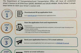 QUEZON CITY, Philippines (Eagle News) — The Land Transportation Office (LTO) announced on Monday (April 03), that Overseas Filipino Workers (OFW) from Bahrain, Qatar, and Saudi Arabia can now apply for a driver’s license card via the Internet. Applicants must fill out a form that can be downloaded from the website www.lto.gov.ph. They should then scan their application form and the following requirements: Passport showing identification details and photo, and the passport page showing the arrival stamp at current country; LTO Driver’s […]