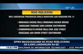 QUEZON City, Philippines (Eagle News) — The Department of Public Works and Highways will conduct road-reblocking starting Friday night (10:00 PM) until 5 a.m. Monday, Friday 13 in some major thoroughfares in Quezon City. The areas that would be affected are the following: In Southbound road: • Along Mindanao Avenue, from Mindanao Avenue Bridge to Tandang Sora Avenue, Quezon City • Along Commonwealth Avenue, from Don Jose Street to San Simon Street, Quezon City • […]
