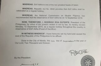 (Eagle News)– The Palace on Tuesday (September 6) proclaimed September 12 as a regular non-working holiday to commemorate Eid’l Adha (Festival of Sacrifice). President Rodrigo Duterte signed Proclamation No. 56 before leaving for Laos. Republic Act 9849 explains Eid’l Adha as “tenth day in the month of Hajj or Islamic Pilgrimage to Mecca wherein Muslims pay homage to Abraham’s supreme act of sacrifice and signifies mankind’s obedience to God.” Eid’l Adha is one of […]