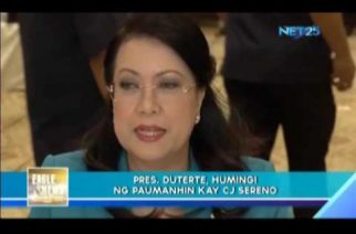 PANACAN, Davao City (Eagle News) — Humingi ng paumanhin si Pangulong Rodrigo Roa Duterte kay Chief Justice Maria Lourdes Sereno sa mga binitiwan niyang salita. Sa isang press conference sa Panacan, Davao City. Sinabi ng pangulo na hindi niya intensyon ang mga masasakit na salita na kaniyang binitiwan. Aniya may nangyayaring patayan dahil sa ilegal na droga at trabaho niyang bigyang-kaalaman ang publiko sa kanilang paligid upang maka-iwas sa anu-mang panganib. Una rito, pinuna ng […]