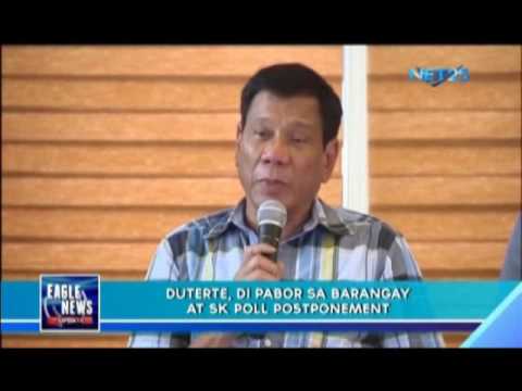 QUEZON City, Philippines – President-elect Rodrigo Duterte is not in favor of the postponement of the barangay and Sangguniang Kabataan elections this October, saying that it would leave a hold-over capacity for the officials. Earlier, the Commission on Elections announced that it may postpone the barangay and SK elections due to the national and local elections. (Eagle News Service description by Jaypaul Carlos, Video Editing by Jericho Morales, Uploaded by MRFaith Bonalos)
