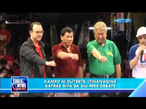 MANILA, Philippines – The camp of Davao City Mayor Rodrigo Duterte denied rumors that he will not attend the second round of presidential debate. Said rumors were connected to alleged online posters regarding Duterte’s controversial visit to the University of the Philippines – Los Baños. Duterte’s camp denied said posters, calling them black propaganda. (Eagle News Service Described by Jay Paul Carlos, Video Editing by Jericho Morales, Uploaded by MRFaith Bonalos)